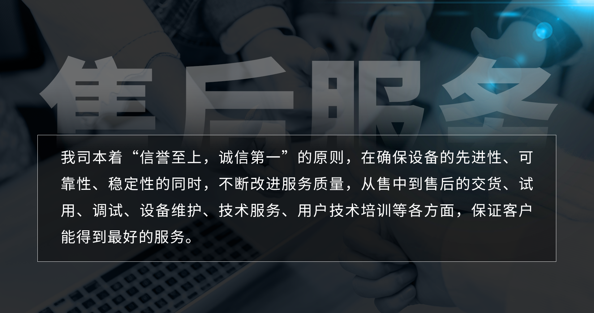 我司本著“信譽(yù)至上,誠信第一”的原則,在確保設(shè)備的先進(jìn)性、可靠性、穩(wěn)定性的同時,不斷改進(jìn)服務(wù)質(zhì)量,從售中到售后的交貨、試用、調(diào)試、設(shè)備維護(hù)、技術(shù)服務(wù)、用戶技術(shù)培訓(xùn)等各方面,保證客戶能得到最好的服務(wù)。