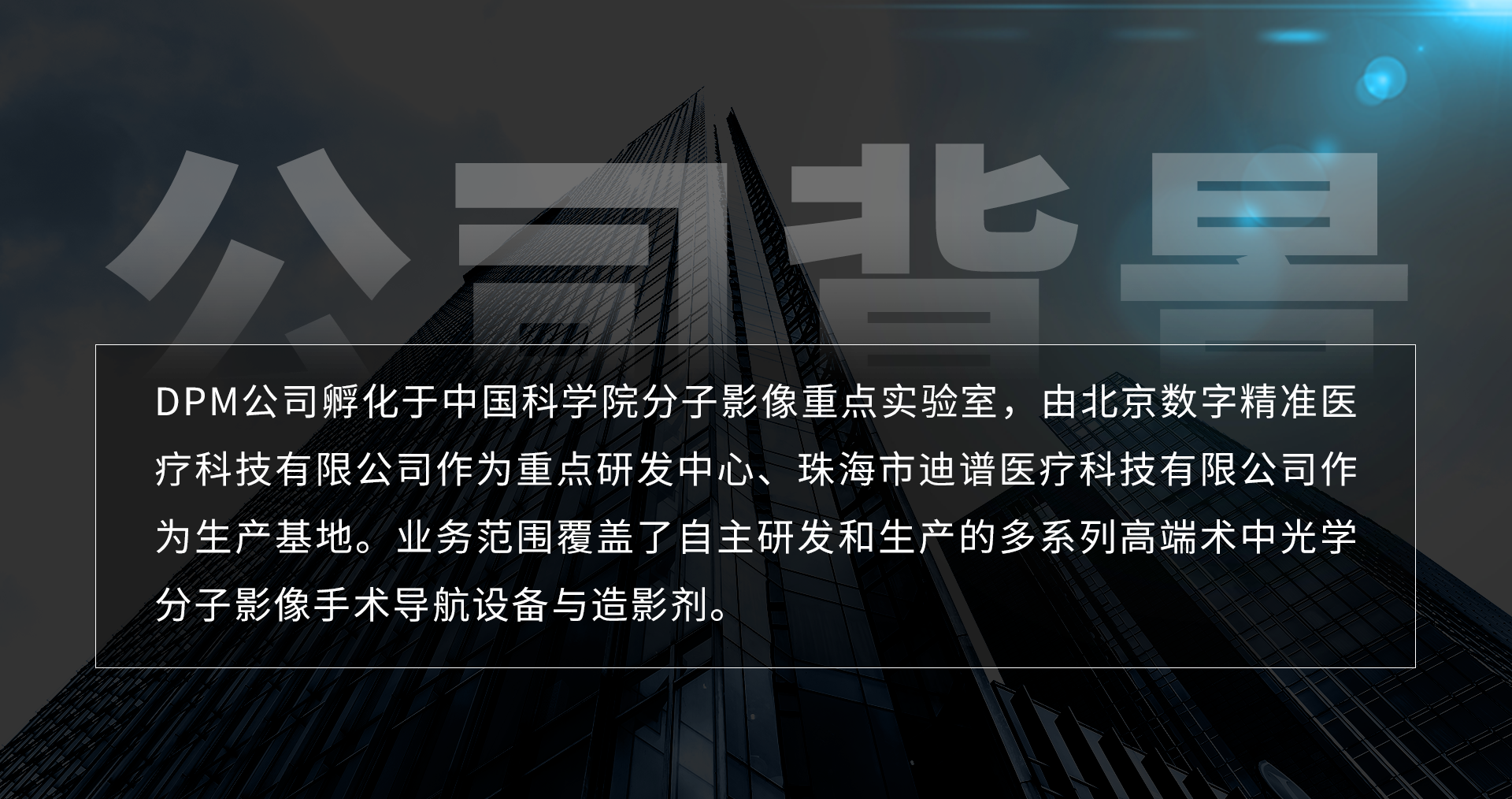 DPM公司孵化于自動化所,由北京數(shù)字精準(zhǔn)醫(yī)療科技有限公司作為重點研發(fā)中心、珠海市迪譜醫(yī)療科技有限公司作為生產(chǎn)基地。業(yè)務(wù)范圍覆蓋了自主研發(fā)和生產(chǎn)的多系列高端術(shù)中光學(xué)分子影像手術(shù)導(dǎo)航設(shè)備與造影劑。